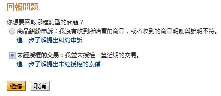 此時會詢問你要回報哪種問題,因為是被盜用所以這裡選擇「未經授權的交易」。