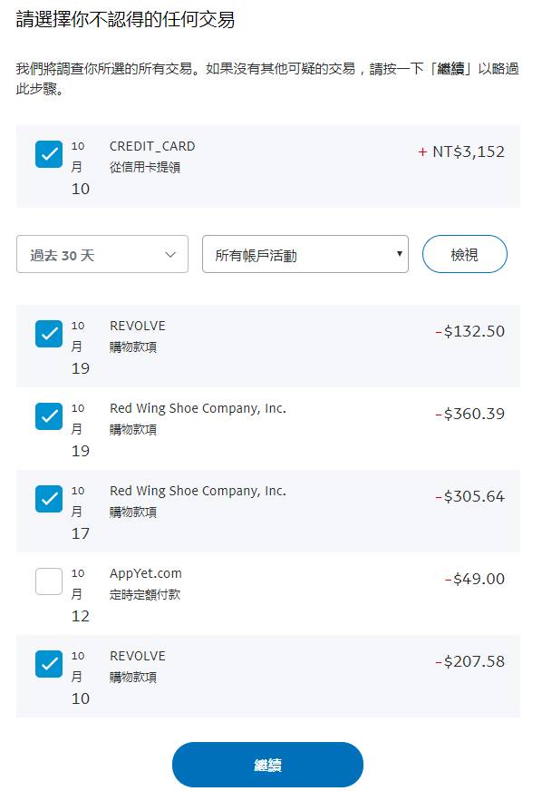 在下一個畫面中會詳細的列出最近的交易紀錄,同樣的,選擇不是你自己操作的交易之後按繼續。