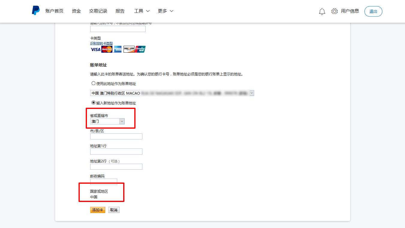 如使用大陸版PayPal,不論居住地址或帳單地址都會有澳門的選擇︰